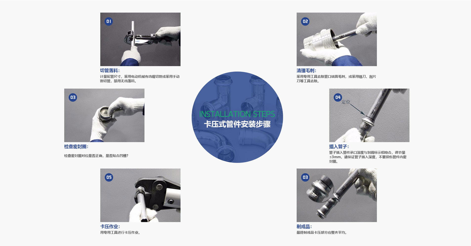 8、安裝簡(jiǎn)便:將管子插入管件后用專(zhuān)用的工具卡壓到位即可,比傳統(tǒng)的焊接或者絲接口簡(jiǎn)便。